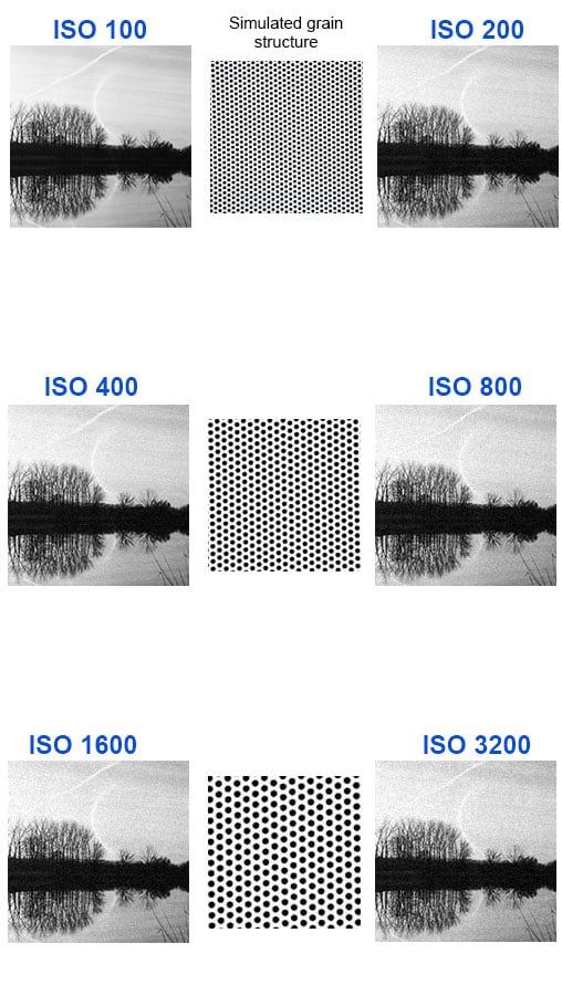 Film grain occurs when silver halide crystals within the film emulsion react to light during exposure. Lower‑ISO films contain smaller crystals and produce finer grain, while higher‑ISO films increase sensitivity but also produce more visible grain.