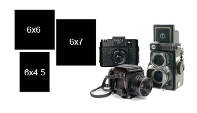 Well‑known medium format manufacturers include Hasselblad, Mamiya, Rollei, and Yashica.