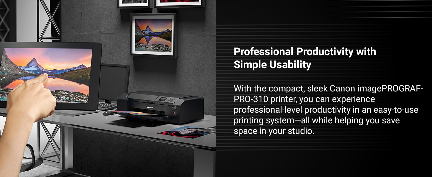 The Canon imagePROGRAF PRO-310 is a professional 13” wireless inkjet photo printer designed for photographers, graphic artists, and creatives who demand exceptional print quality.
