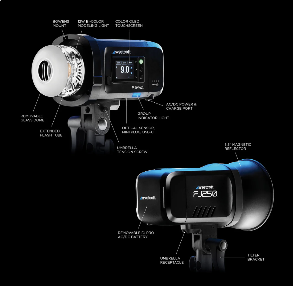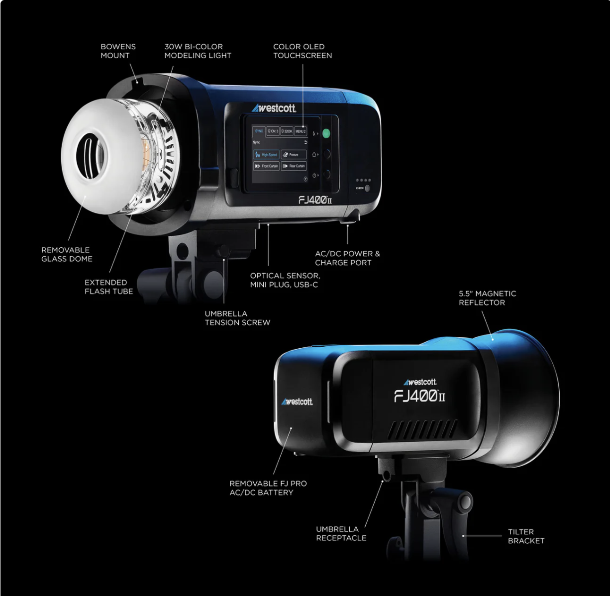 AC/DC batteries deliver 550+ full-power flashes per charge on the FJ400 II and 850+ on the FJ250