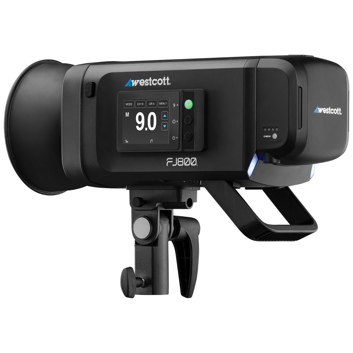 The FJ800 comes with a Magnetic 5” Reflector, Magnetic CCT Gel Set with CTO, 1/2-CTO, Diffusion, and Window Green gels. The built-in tilter bracket with 9mm umbrella mount offers secure mounting and positioning of large umbrellas and modifiers.