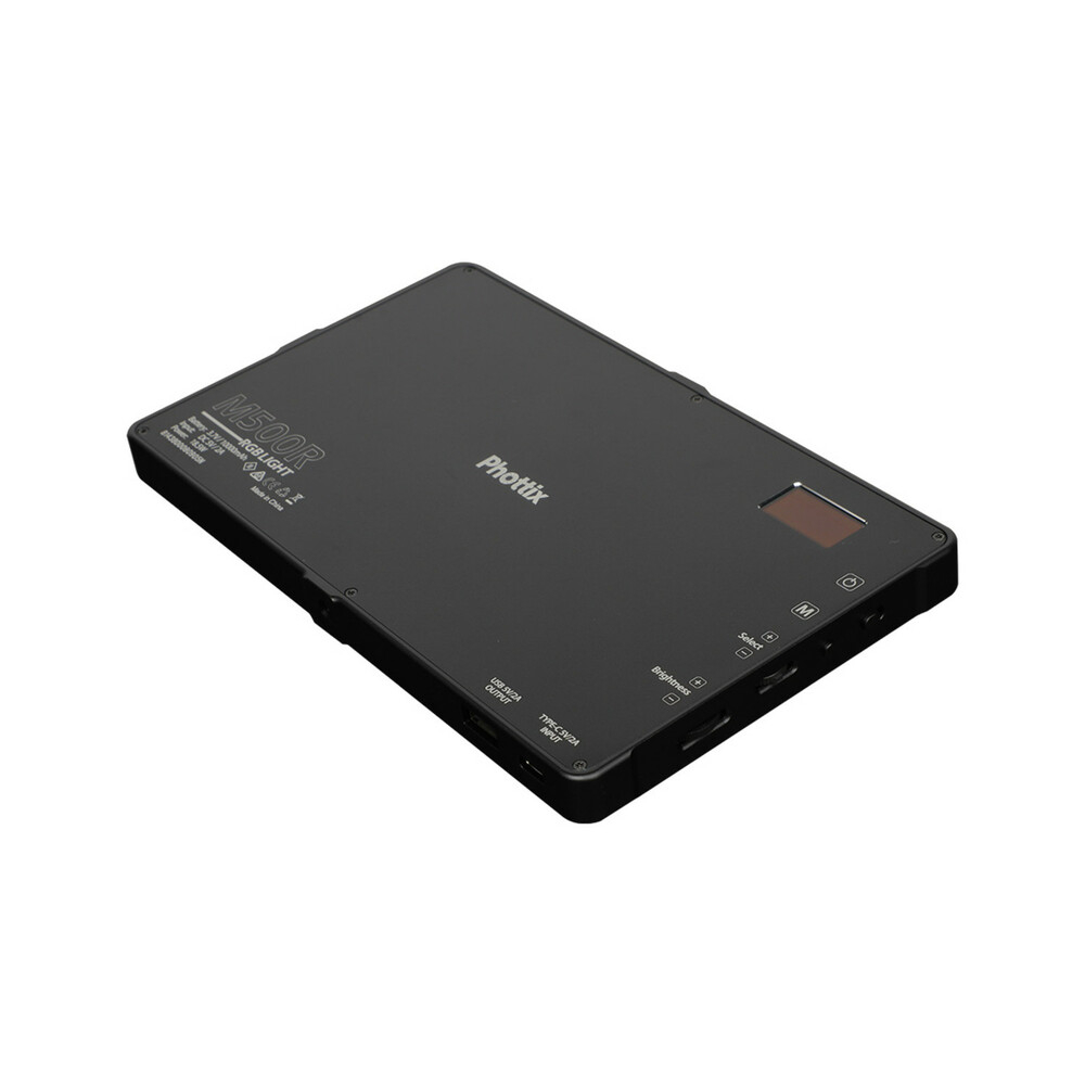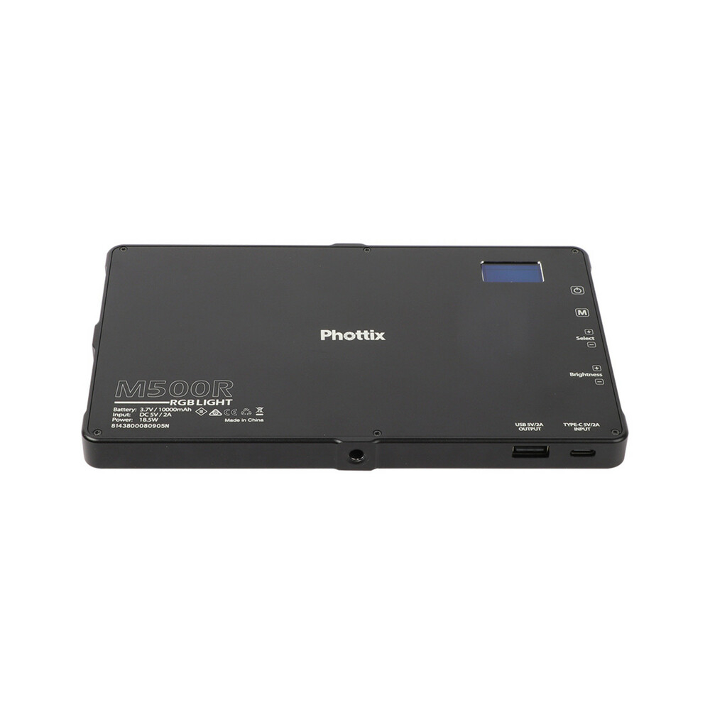 The Phottix M500R RGB Light is a new generation RGB light that uses the latest in flicker-free LED technology for mobile phones and cameras. The M500R is ideal for smart phone users and on-the-go creators, and is perfect for shooting weddings, interviews, portraits, videos, and macro shots. The M500R is for anyone who needs extra light for photos, video, vlogging, or live streaming. In addition to inheriting the attractive ultra-thin body design of the M180, the M500R is rated at CRI 96+ for accurate color rendering, features bright high-performance LED’s, an adjustable brightness and color temperature (3200K-5600K) control function, full 0-360 degrees color hue and saturation adjustment, 21 preset multi-scene lighting effects, and can also be used as a power bank. Approximately the size of a smartphone, the back of the light features a bright LCD screen that provides a display of color temperature, effects, and battery level. Adjustments can be made by a button and wheel controls to adjust settings such as color, brightness, and effects modes. Getting creative with the M500R is easy and quick. In RGB mode, the M500R allows you to choose from a wide spectrum of colors to alter your background as well as get creative in many other ways. The selectable colors function as built-in color filters that can be controlled with hue, saturation, and brightness adjustments using a 360° RGB color wheel. The M500R features 21 different multi-scene effects in seven groups such as Flash, Candle, Police, Fireworks, Strobe, Club, and more! Creativity knows no limits! 21 Preset Scenario Effects: Group A: Flash / Flash Fast / TV screen Group B: Candle / Flame 1 / Flame 2 Group C: Police / Ambulance / Fire truck Group D: Strobe Lights 1 / Strobe Lights 2 / Strobe Lights 3 Group E: Chase slow / Chase mid / Chase fast Group F: Fireworks 1 / Fireworks 2 / Fireworks 3 Group G: Club 1 / Club 2 / Romantic The M500R built-in 4000mAh battery is rechargeable via a USB Type-C port. There is also a USB Type-A output that can be used as a power bank port to charge other accessories or mobile devices. The M500R also includes a handy and versatile mini-tripod with secure locking and tilt capability, a cold shoe adapter, USB Type-C cable, hand strap, and carry pouch. A 1/4"-20 thread on the bottom of the light allows for mounting it using the included cold shoe mount onto your camera, or it can be mounted on a stand or handheld mount with a 1/4"-20 screw. The cold shoe adapter also features a 1/4"-20 thread on the bottom for additional mounting options.